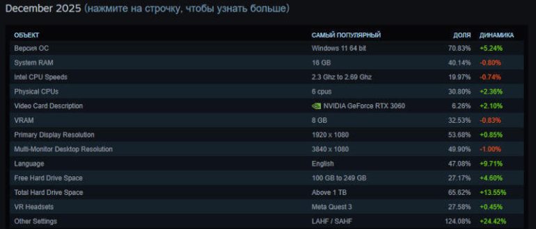 Valve опубликовала статистику Steam Hardware Survey по итогам декабря 2025 года: в игровом сегменте AMD активно подбирается к позициям Intel. И, несмотря на мировой дефицит, геймеры продолжают наращивать…