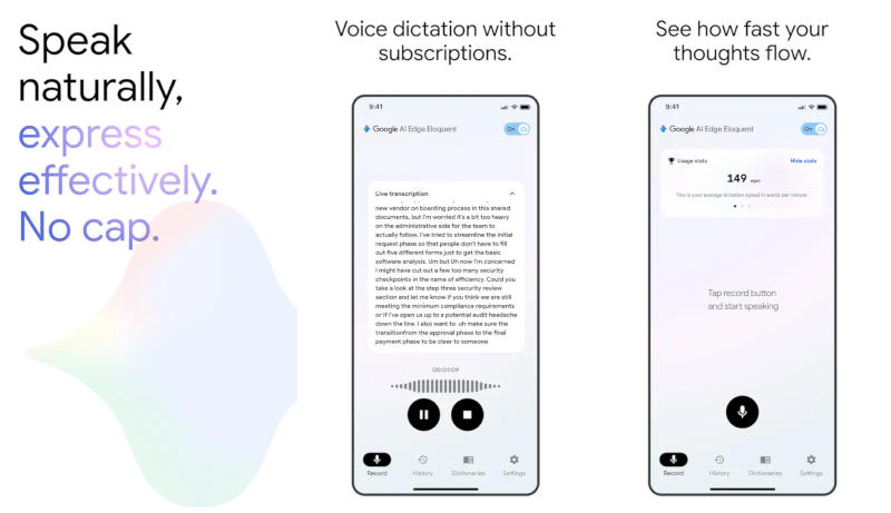 Приложение сохраняет историю сеансов расшифровки устной речи и позволяет производить поиск по всем сеансам. Оно выводит слова, которые пользователь диктовал в последнем сеансе, показывает скорость речи и общее количество произнесённых слов. В настоящее время Google AI Edge Eloquent доступно только для Apple iOS, но компания обещает выпустить его и для Android, причём с интеграцией в систему — его можно будет выбрать в качестве стандартной клавиатуры.