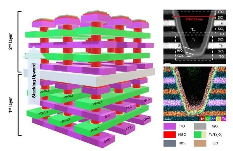 Не менее хитро продуман техпроцесс производства новой памяти, и он предельно простой — заключается всего в одном экспонировании и одной обработке после экспонирования. Литографическая обработка производится сразу для заранее подготовленной многослойной пластины, состоящей из пяти нанометровых слоёв полупроводников, таких как материалы IGZO, тантал и другие, разделённых четырьмя слоями изолятора в лице диоксида кремния.
