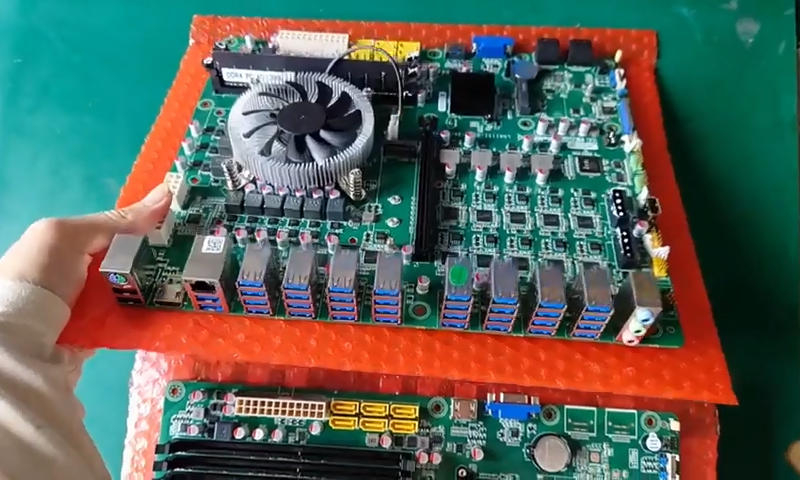 Есть предположение, что это не «оригинальные» материнские платы, а модифицированные версии с дополнительными USB-интерфейсами и контроллерами, предназначенные для конкретных целей. Это могут быть также масштабное тестирование устройств или даже майнинг. Интересно, что сокеты на этих материнских платах — это Intel LGA 1151 эпохи Skylake/Kaby Lake. Маркировка бренда на платах отсутствует, так что это OEM-продукт. На месте два модуля оперативной памяти и штатный кулер; остаётся даже место для видеокарты.