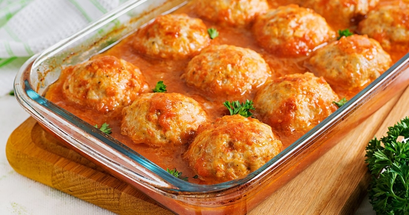 - Глубокий противень смазываем растительным маслом, формируем тефтели, укладываем их и заливаем сметанно-томатным соусом. Отправляем в духовку, разогретую до 170–180 градусов, на полчаса — минут сорок.