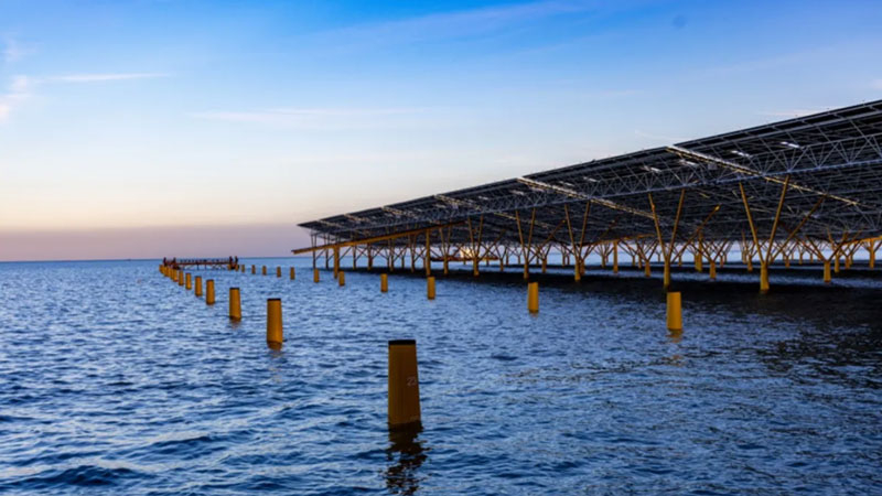Монтаж панелей ведётся на сваях, забитых и залитых бетоном в морское дно. Забивку свай осуществляет платформа с GPS-позиционированием для точной привязки проекта к местности. Солнечные панели располагаются сегментами на платформах размерами 60 × 35 м — это примерно как пять баскетбольных площадок. Используются двухсторонние панели, и каждая из них установлена с наклоном 15 градусов, чтобы тыльная сторона улавливала отражённый от воды солнечный свет, что повышает общую выработку.